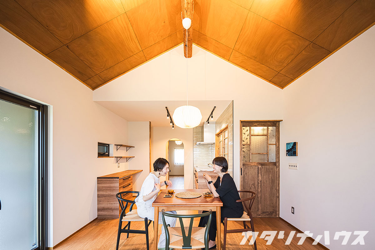 築43年の平屋住宅をリノベーションしてお住いの松山市のI様。 以前はご両親がお住まいでしたが、リノベーションして住まう事を決意されました。 縁側と和室で構成されていた住宅を、現在の生活スタイルにあわせて大きく変更しました。 玄関からのアクセスは、来客用と土間収納を経由しての家族用があるので、玄関廻りは常にすっきりとして使いやすくなりました。 玄関を抜けるとすぐに手洗いカウンターがあり、手洗いの定着した新しい生活様式のスタイルです。 リビングはキッチンと一体となっており、アイランドキッチンを採用、家事をしながら家族とのコミュニケーションも容易です。 特徴的な天井は、ラワン仕上げに自然塗料のオスモカラーを塗布して仕上げました。あらわしの梁桁は既存の架構を研磨してリメイクしています。すべて勾配天井にするのではなく、キッチン上部は天井兼ロフトスペースを設置することで、落ち着きとインパクトを空間に吹き込みます。